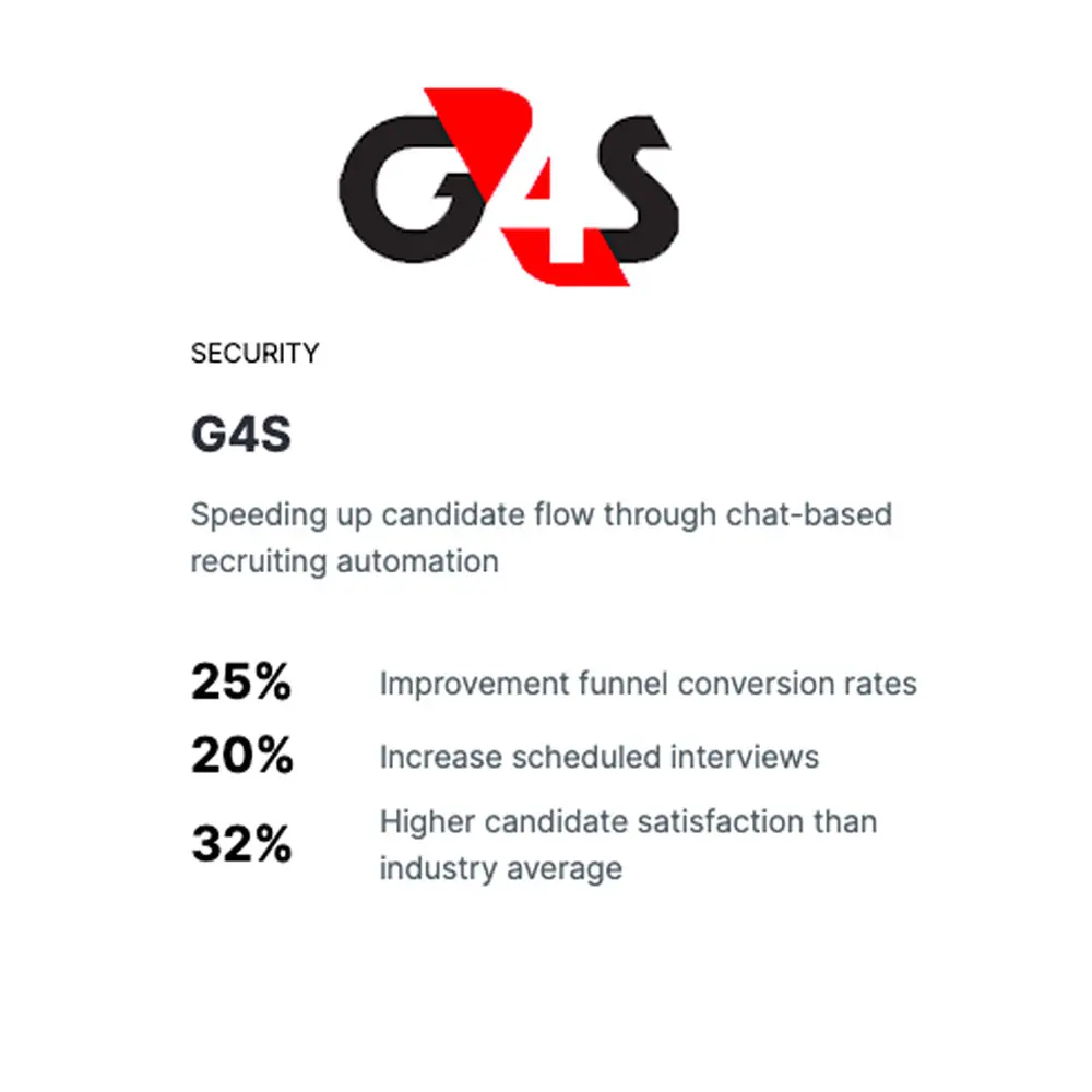 G4S is a British multi-national private security company. They wanted to speed up candidate flow, deliver a simple and engaging candidate experience, and reduce time to interview.