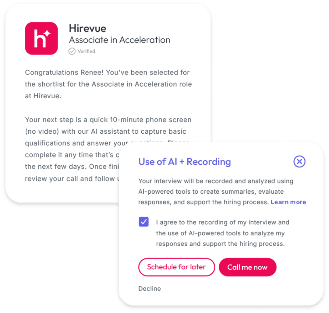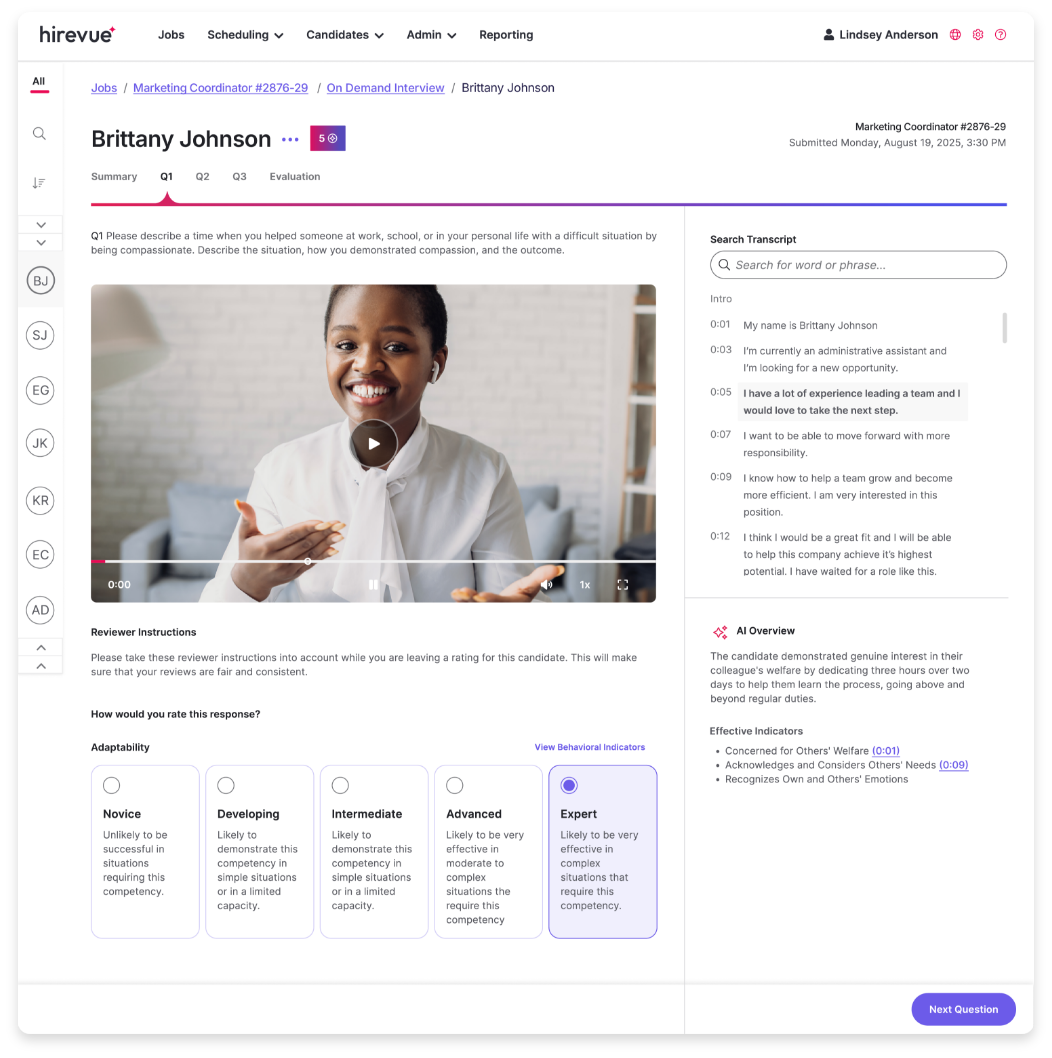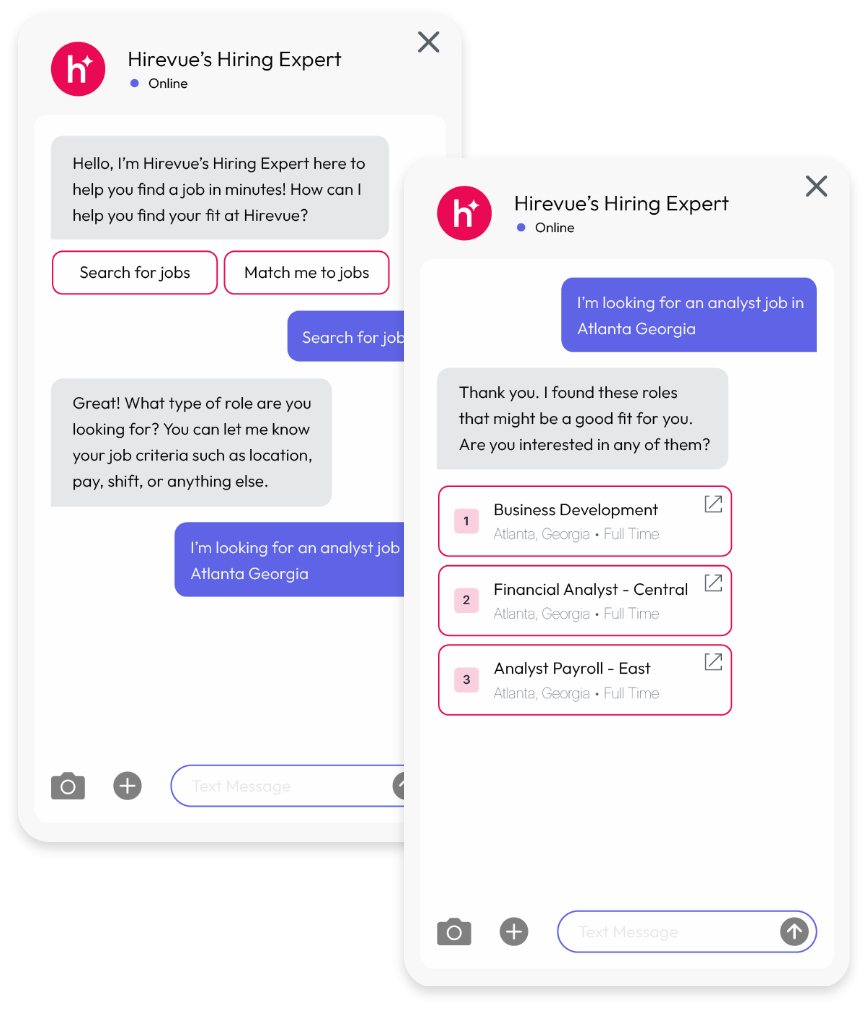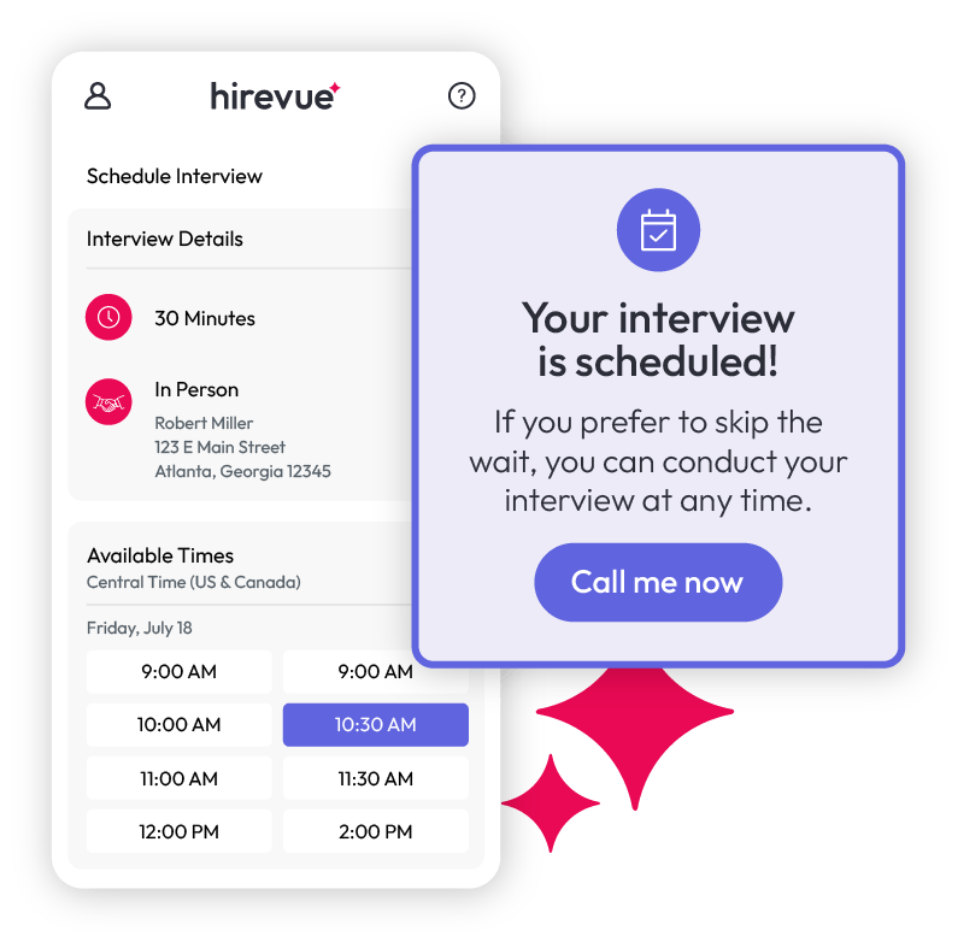 Give every candidate a hiring experience that respects their time and treats them fairly—with a human touch. Hirevue’s AI agents feel more adaptive and human than a bot but still meet people when and where they are. Agents are ready 24/7, accelerating a faster hiring journey and delivering the rich insight recruiters need while still making candidates feel valued.
