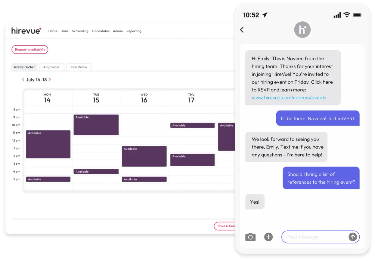 Make event management effortless with online interview scheduling tools. Pre-set calendars let candidates self-schedule at their convenience, whether for graduate hiring events, career fairs, or large-scale recruiting. Just send invites via text or email using our scheduling tools for recruiters.