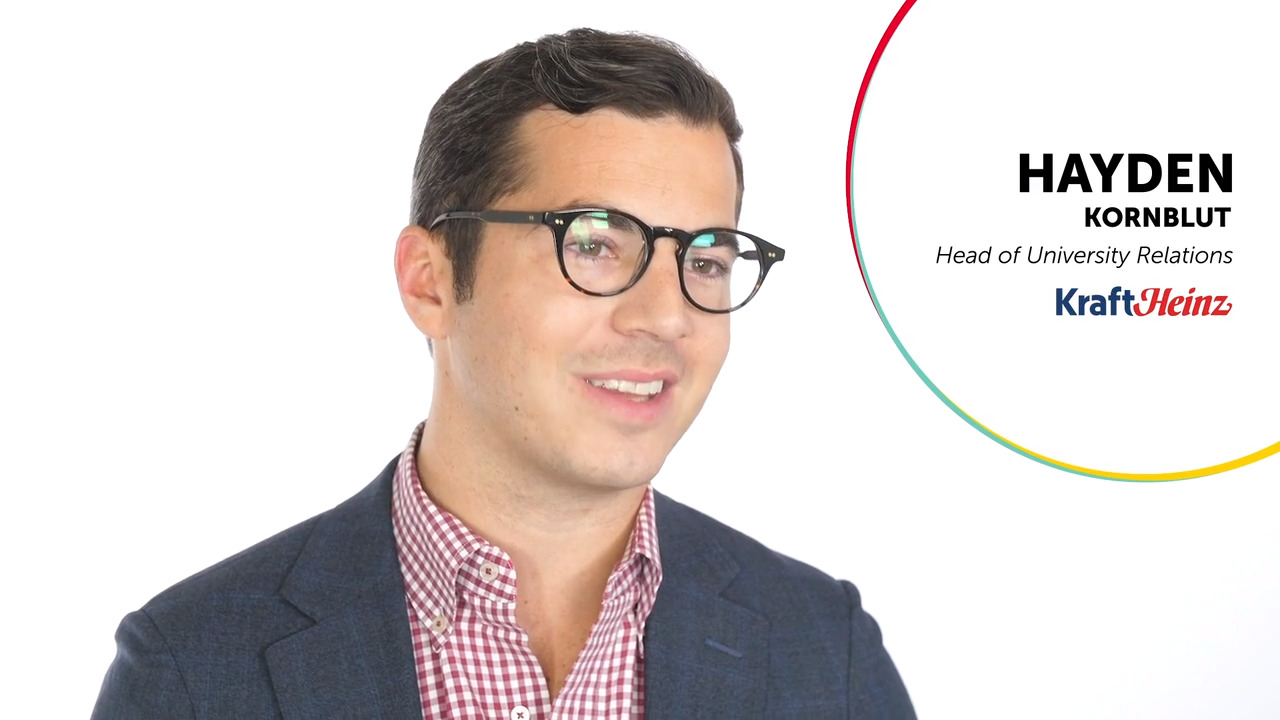 | Hayden Kornblut | '- So my name is Hayden Kornblut. And I'm the Head of University Relations for KraftHeinz. Life's before HireVue was pretty tedious. And the recruiters we implemented with had never used HireVue before. And they've really enjoyed it. We've personalized our interview process. First, I would say namely we have recorded videos of all of our former interns and trainees who are actually asking the questions. So when a candidate is going through the process and they get a question, it's someone who's actually, a recent graduate just like them asking them the question. We also have an introduction and an exit video that introduces them to the process, to the company. And then at the end it gives them the kind of process going forward. I actually got an email earlier this week from a candidate who just went through the HireVue interview on the On Demand Interview, and they were elated with it. They told us that, they had never really done an On Demand Interview before but really enjoyed it, enjoyed the videos that we had in the beginning for the questions and at the end and overall enjoyed the process, thought it was easy, they thought it was convenient and really able to do it on their own time. What I'm seeing personally is that there are great students everywhere, but I physically can't get to everywhere students are. So being able to utilize a technology like HireVue to get out in front of these students, and more importantly get them in front of us as well, so that we don't overlook them, but just seeing them kind of flourish and grow both personally and professionally to me is the absolute best thing. Just being able to open up our opportunities to more students from more backgrounds more disciplines is gonna be vital for us to continue. |