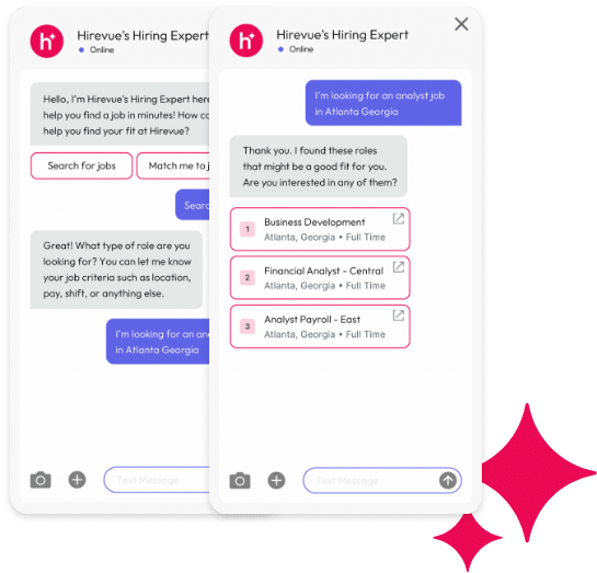 Combat labor shortages and high turnover head-on. Hirevue’s mobile-first platform meets candidates where they are—on their phones. Our AI-powered recruiting expert enables instant job matching, seamless applications, and interview scheduling within minutes. Transform your retail hiring process and ensure you have the right talent, right when you need it.